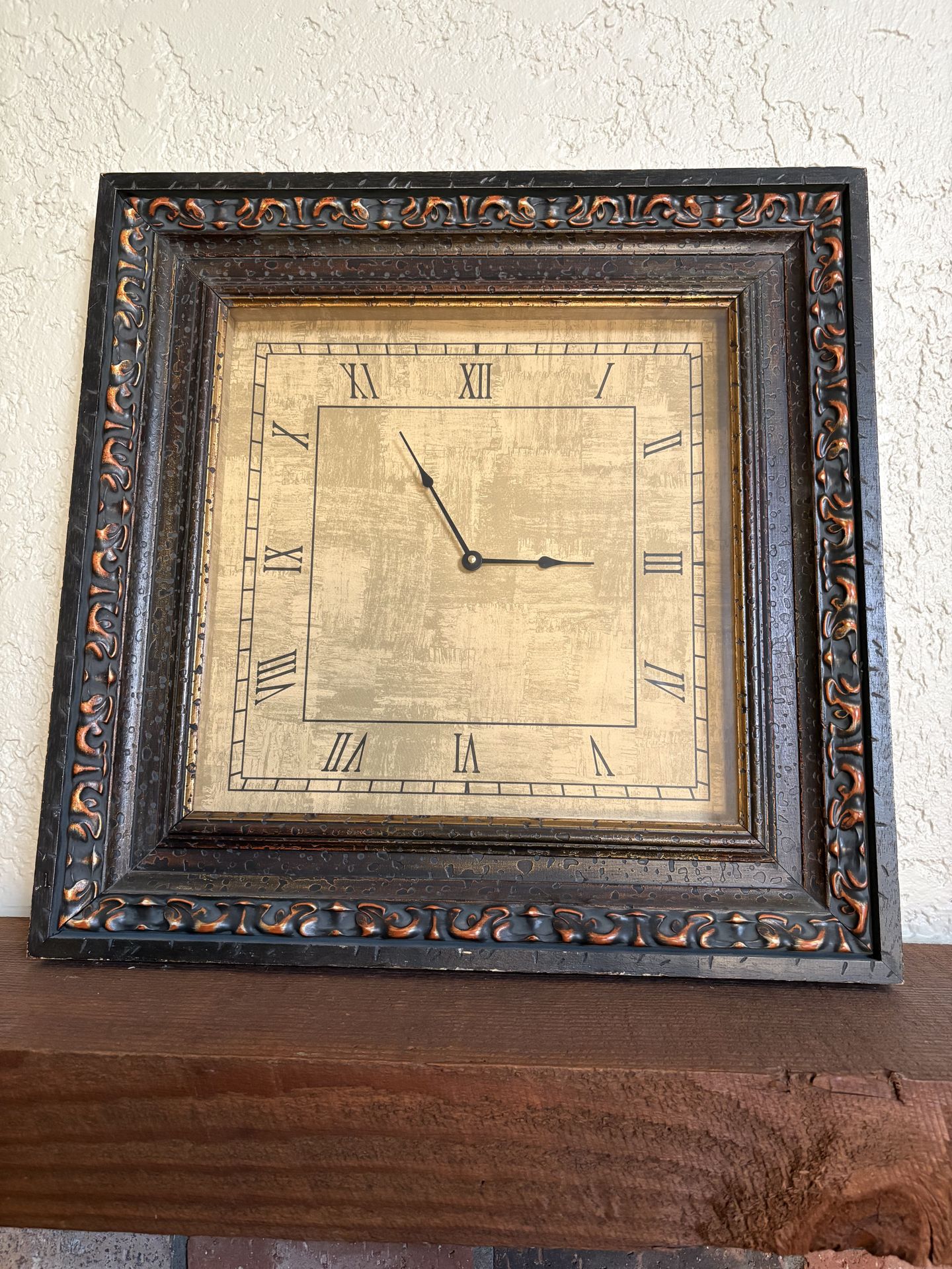 Old World 23” square wall clock with dark wood frame and muted gold accents; beautiful above a fireplace or in an entryway