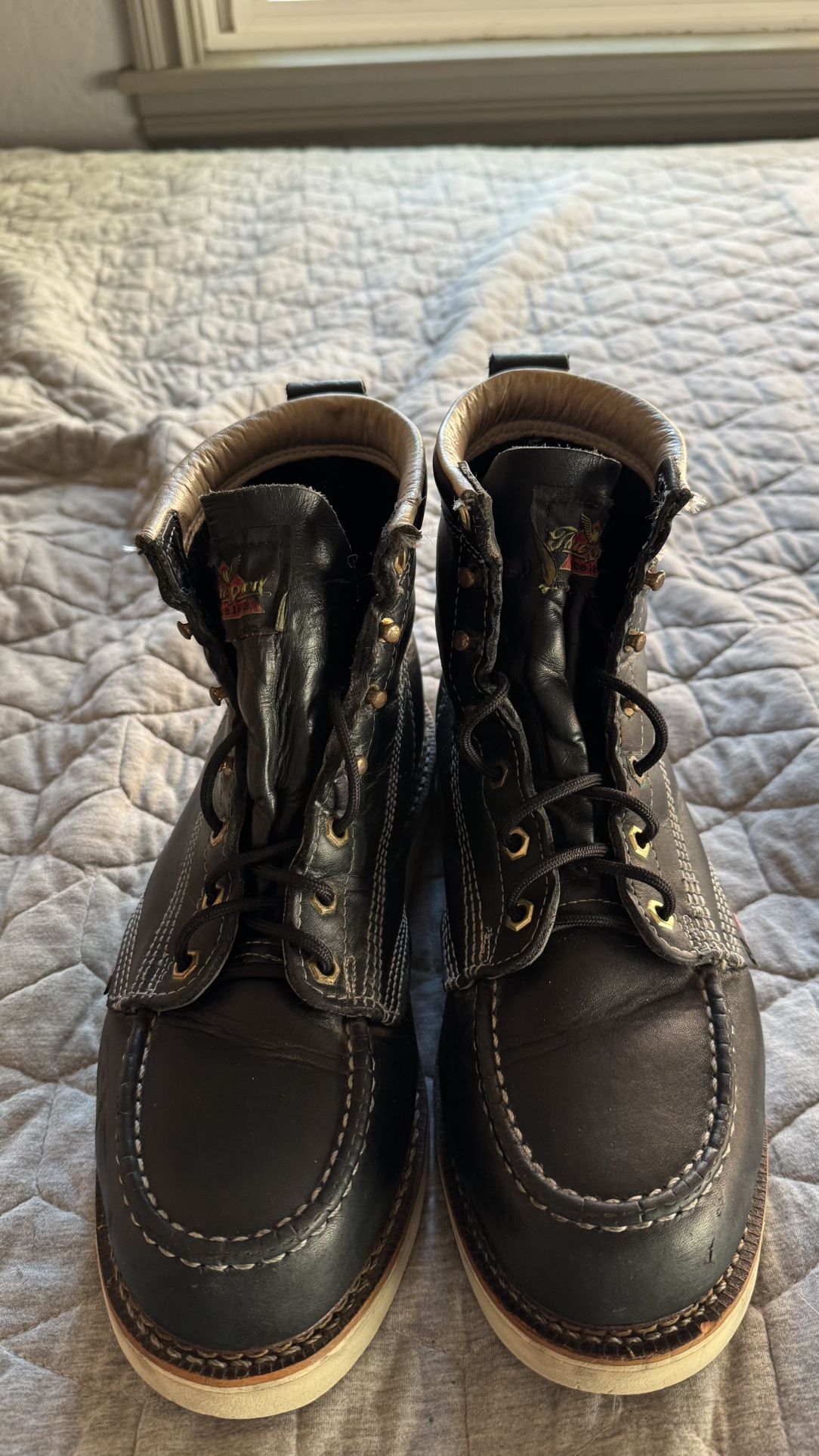 For sale a pair of lightly used Thorogood steel toe work boots. Size 8.5, oil resistant, slip resistant, max wear wedge.