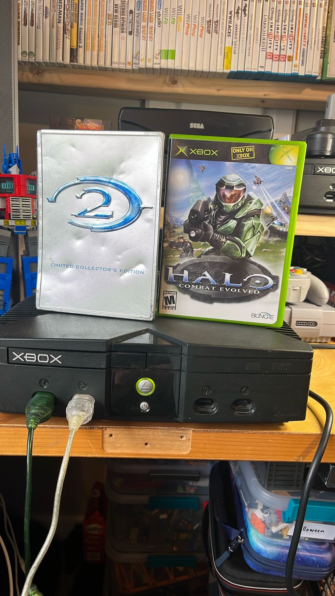 Comes with console, power cord, av cable and two controllers. Also includes Halo 1 and Halo 2.