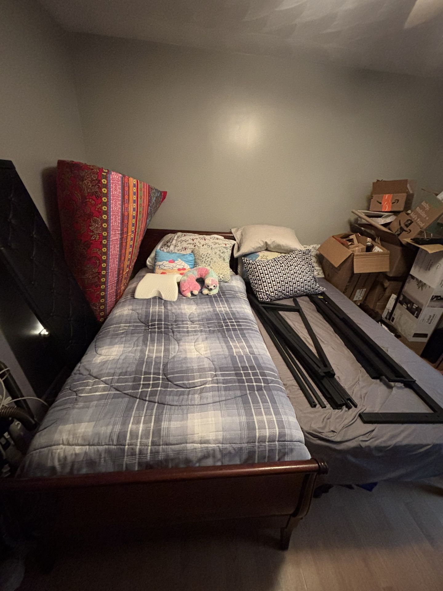 If you’ve ever wanted to furnish a bedroom, clean a house, cool a room, AND type like a professional dragon-slayer… today is your moment. I’m selling a curated collection of household greatness, each item lovingly gathered with the chaotic grace of someone who finally admitted, “Yeah… I own too much stuff.” 🛏️ Beds for Days • TWO Twin Beds + Frames — Perfect for kids, guests, or that one friend who “just needs to crash for a few days”… for four months. • Queen Bed Frame + Headboard — For the royal sleeper who deserves to wake up feeling majestic. 🛌 Bed Sheets & Pillow Cases (Queen + Twin Mix) An assorted bundle of soft, comfy fabric goodness. Think of it as a “mystery box,” except the mystery is how you ever lived with fewer sheets. ❄️ Air Conditioner Blasts cold air like it’s powered by the Arctic itself. Ideal for the summer, or those who simply refuse to sweat indoors on principle. 🤖 Roomba A hardworking little robot who will judge your crumbs but clean them anyway. Very loyal. Very round. Very good at its job. 🧹 Vacuum Cleaner For when you want to pretend you’re responsible and do some “manual labor” like it’s 1993. Sucks… in all the right ways. ⌨️ Gaming Keyboard RGB lights included, because your keystrokes should look like a laser show. Perfect for gamers, coders, or anyone who likes to feel powerful while typing emails. ⸻ 🎉 Everything is priced to sell, and open to reasonable offers — because I’m realistic, but not delusional. If you need furniture, cleaning power, or a keyboard that makes you feel like a cyberpunk hacker, this is your sign. Send me a message — let’s make a deal and help these items find a new home where they’ll be appreciated, admired, and maybe occasionally dusted.