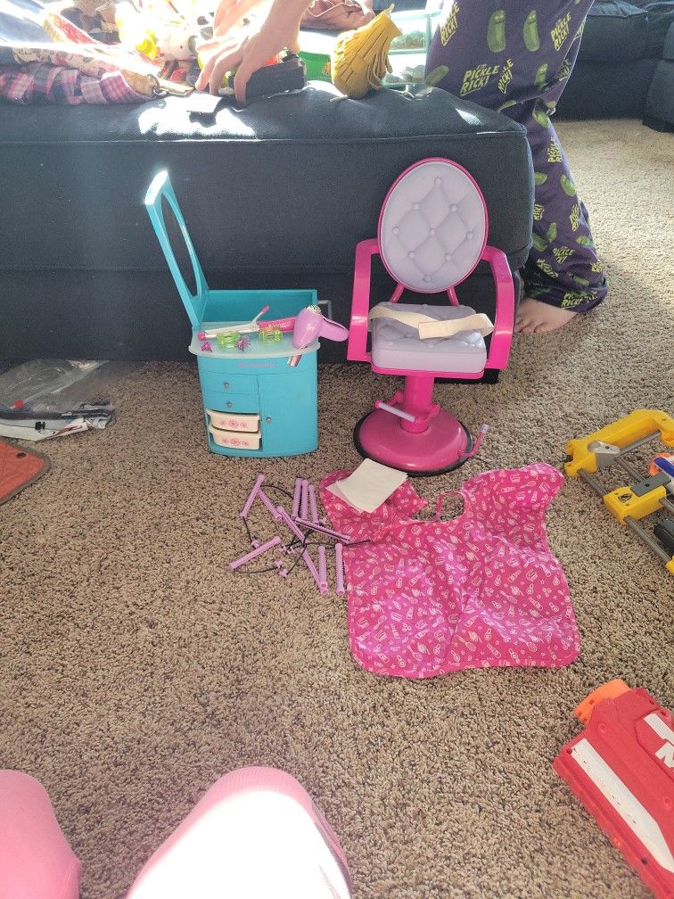 This consists of the American Girl salon chair, the blue salon caddy with the hair dryer which makes real noises, curling iron, hair clips, perm rollers and papers, and salon cape. This is 3 sets that are sold separately all together. Bought new and in excellent condition! Smoke free home!