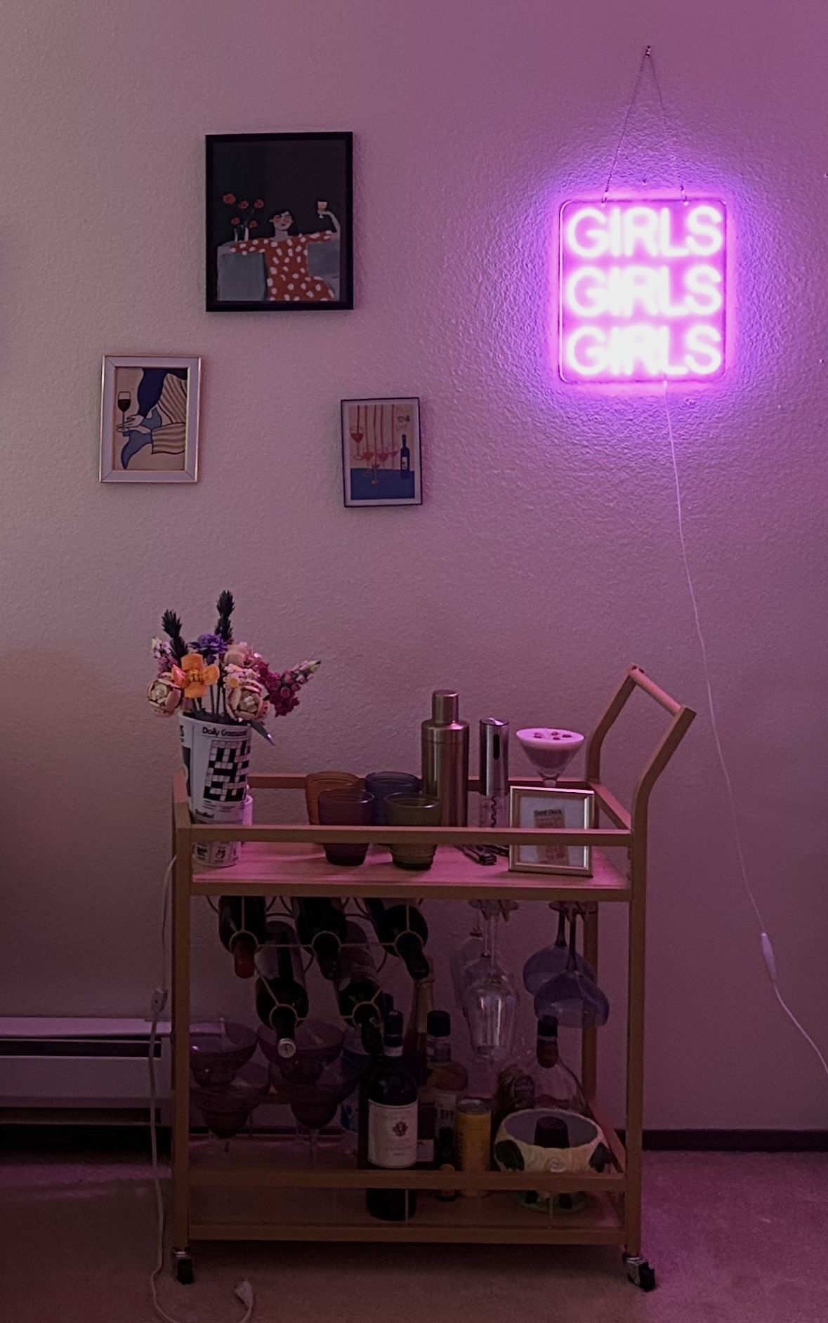 Gently used bar cart for sale- has wheels for easy transportation! It is a great cart I just don’t have room in new place. Able to hold 5 bottles of wine and about 6 wine glasses as pictured Dimensions: 27 inch long 27 inch height ***34 inch height from ground to handle** 13 inch width **decor not included just cart