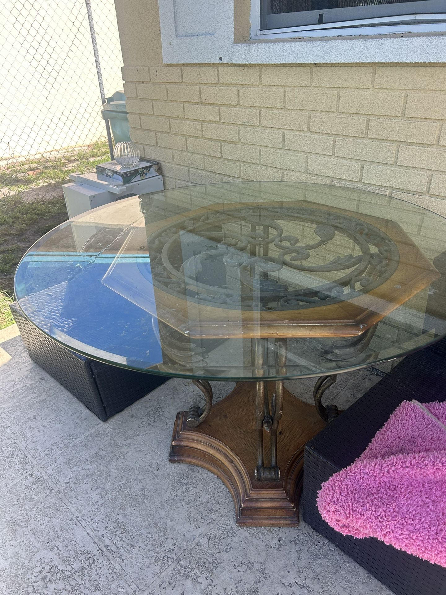 Heavy glass beautiful light wood base kitchen and living room or den table .