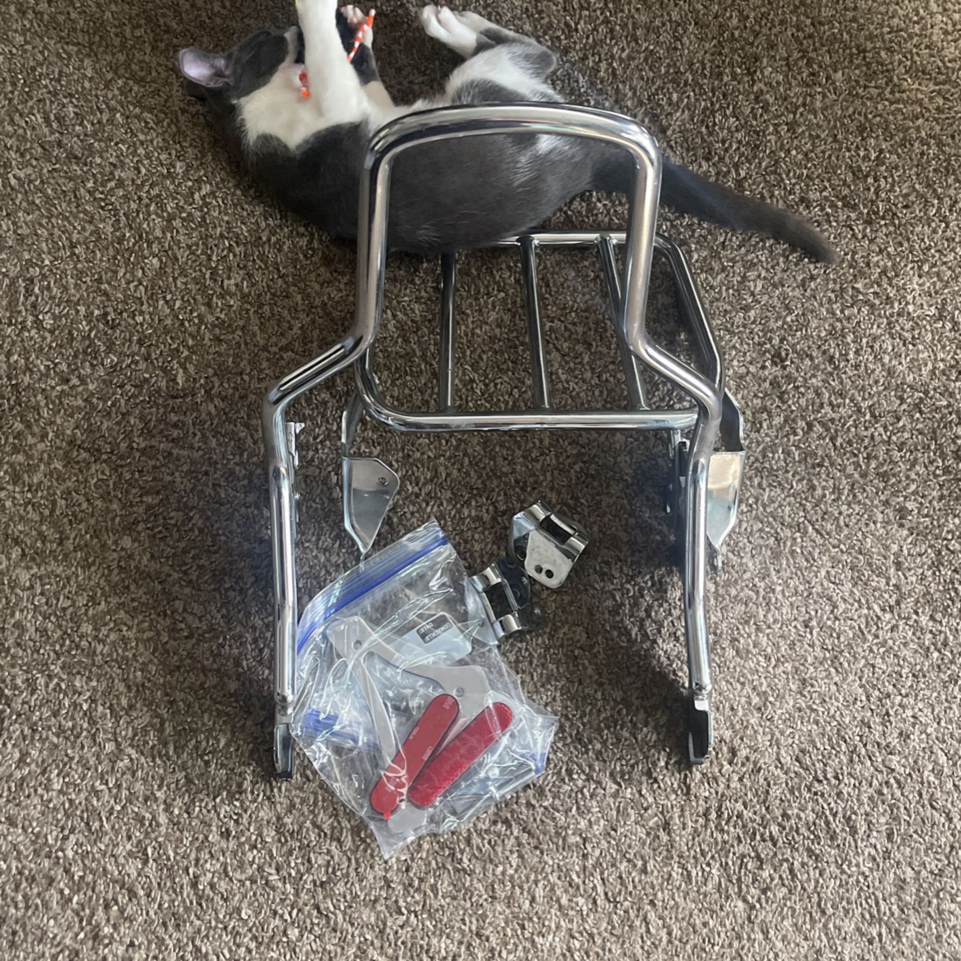 Quick release backrest and luggage rack for 2018 and up soft tail models (may fit other years and models, but I can’t confirm). Everything (except pad) you need to add backrest and storage to existing HD quick release hardware. KITTEN NOT INCLUDED!