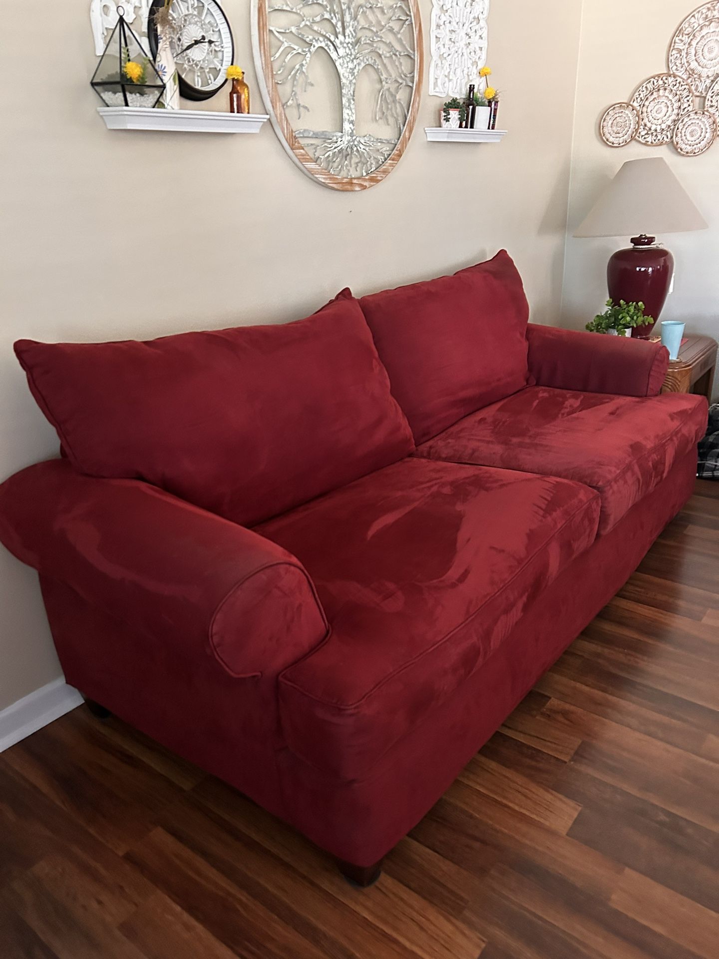 No rips or tears. Looks more red in the picture; but, it’s more of a burgundy color…non smoking household, just needs a little cleaning.