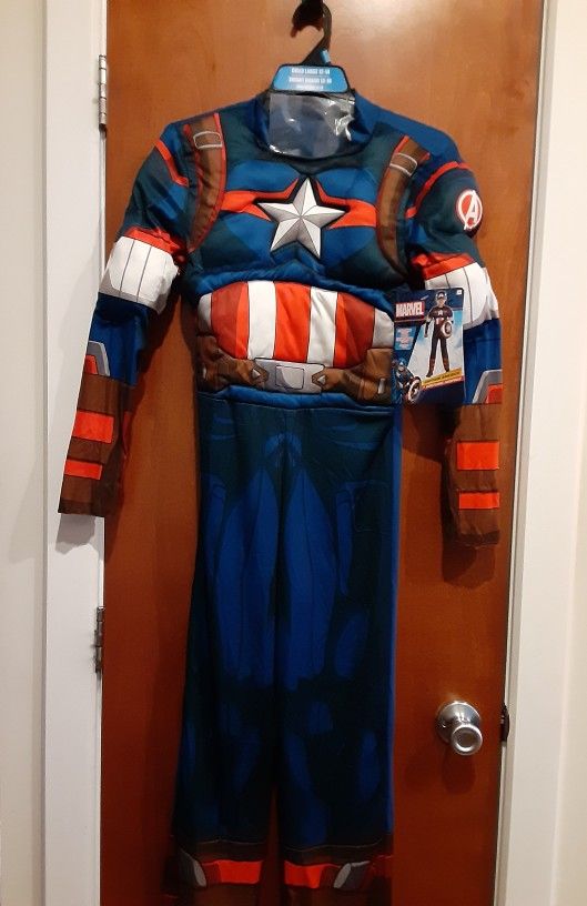 Two youth-size costumes to be sold together. New and unworn. All original packaging. Marvel Captain American suit has faux muscle padding in chest and arms and includes mask. Coveralls costume could be horror-themed when paired with scary mask, or could also be "Top Gun" or auto mechanic-themed. Cash preferred.