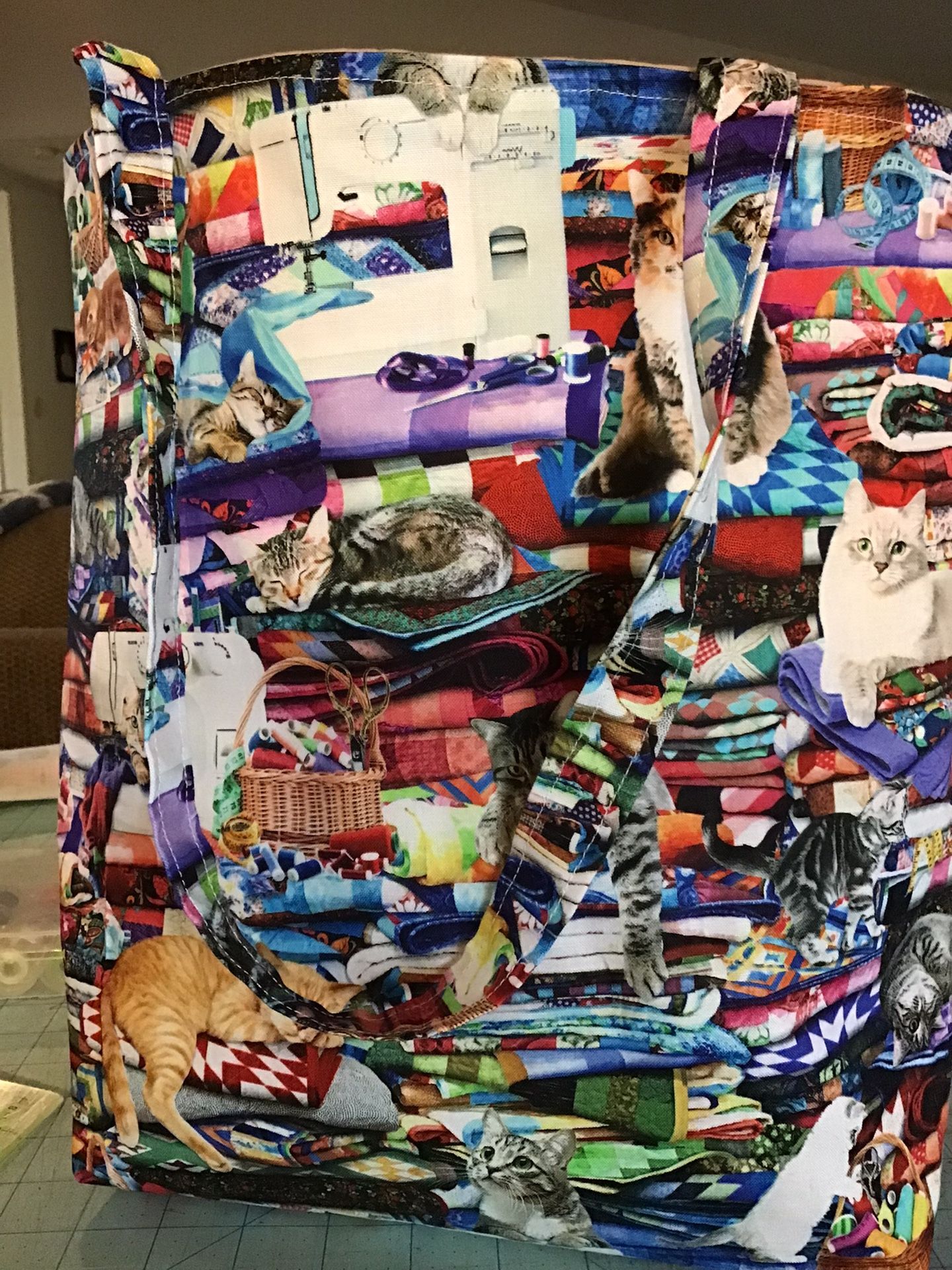 Handmade tote bag with handles. Quilting kitty print . Has brown lining and pocket inside. Would make a great gift bag, book bag, grocery bag, etc. Size 16 by 16 inches.