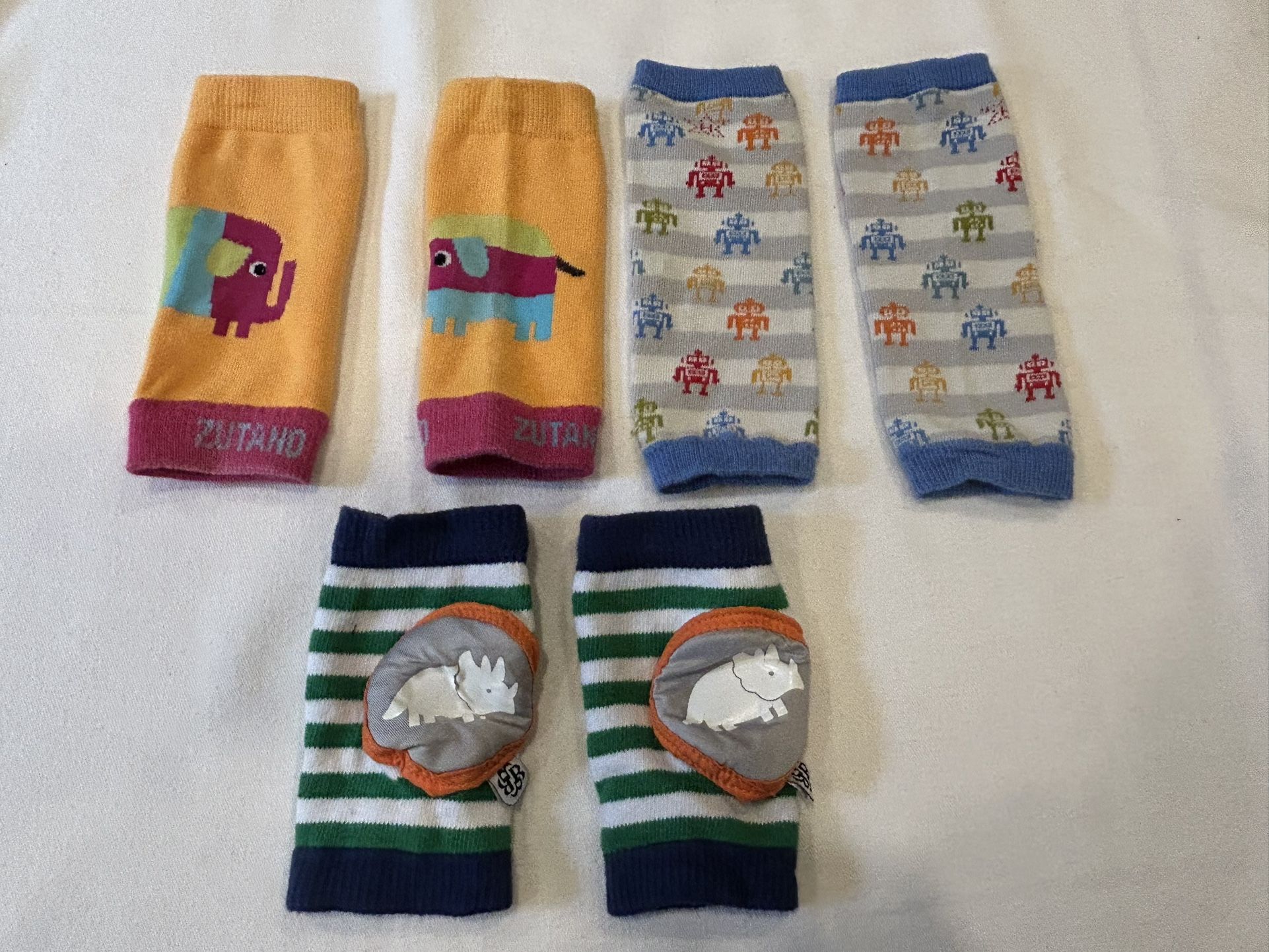 Baby 3 leg covers. 1 pair of crawling knee pads and 2 pair footless socks. All can be helpful when baby learning to crawl and minimizes wear on knees. Robot, elephant and dinosaurs graphics. All great condition. Local pickup in north Portland