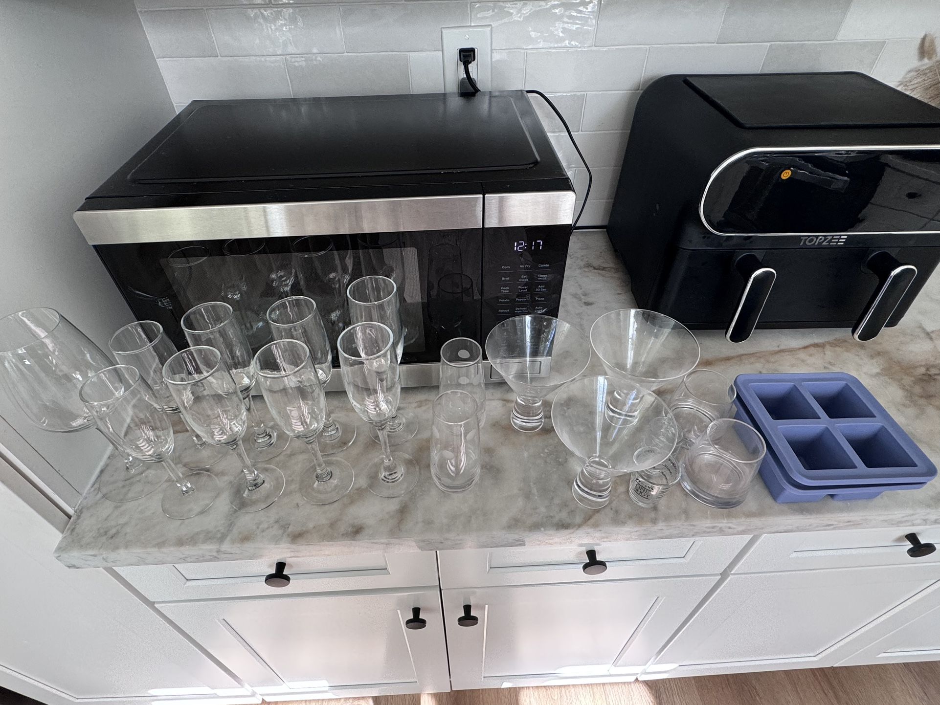 Selling a 20-piece assorted glassware set in good used condition. Includes a mix of martini glasses, champagne flutes, wine glasses, scotch glasses, shot glasses and ice cube molds. Great for entertaining, home bar setup, or parties. All items shown are included. No chips or cracks. Sold as a set only.