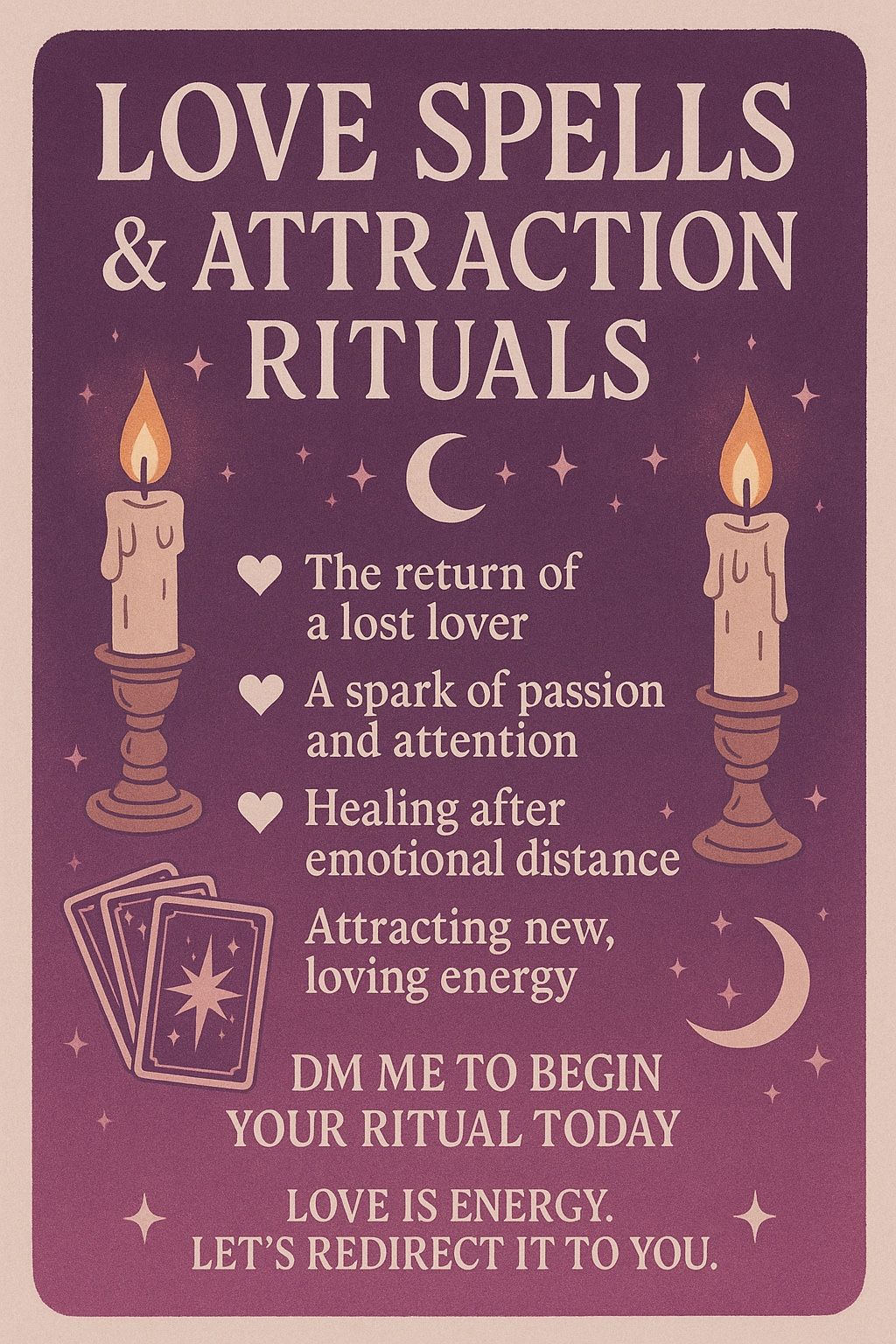 Unlock the energy of love, attraction, and emotional harmony with a personalized ritual crafted just for you. My love-spell sessions gently influence energetic pathways to bring alignment, clarity, and warmer connection between you and the person you desire. Whether you are seeking: ❤️ The return of a lost lover 💘 A spark of passion and attention 💞 Healing after emotional distance ✨ Or simply attracting new, loving energy into your life— I work with intention-based magic, candle rituals, tarot insight, and energy channeling to create the shift you’re longing for. Each session includes: • A detailed reading to identify your unique situation • A customized ritual designed specifically for your name + your target’s name • Photos/videos of the ritual (optional) • A written explanation of what to expect over the next 7–21 days • Follow-up check-in on energetic progress My work is gentle, ethical, intention-driven, and never harmful. Love magic amplifies connection—you choose the direction, I guide the energy. DM me to begin your ritual today. Love is energy. Let’s redirect it to you. ✨
