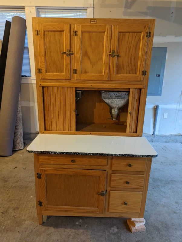 Solid wood hoosier cabinet with flour mills. This would be a great restoration project for someone with the time. One leg is missing and the sliding cupboard is stiff/gets stuck easily. Countertop is in excellent condition. This cabinet comes in two separate pieces (upper cabinet detaches from base) for easier transport.