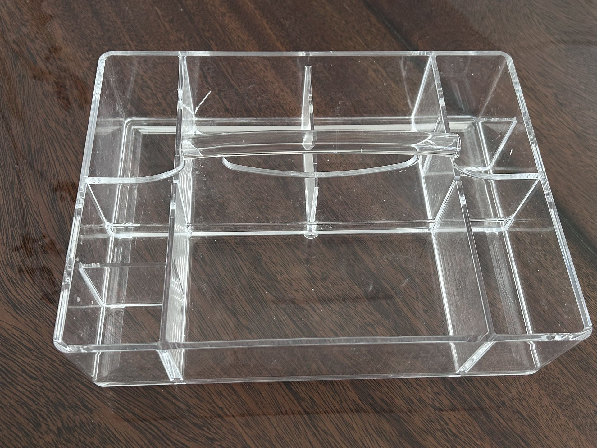 Clear acrylic open-top organizer with center handle. Features multiple compartments for organizing makeup, skincare, jewelry, or small household items. Great for vanity, bathroom counter, dresser, or desk. Pre-owned with light surface scratches from normal use. Clean and sturdy. Easy to carry with built-in handle. Local pickup. Open to reasonable offers. Bundle discount available. Check out my other listings!
