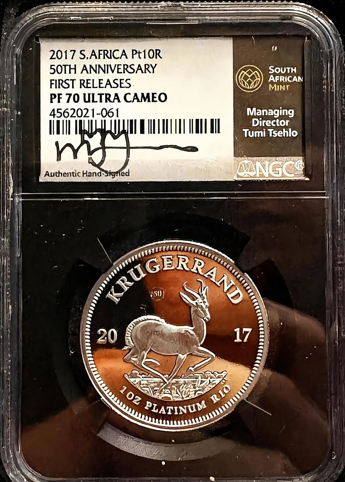 2017 South Africa Platinum Krugerrand, struck to commemorate the historic 50th Anniversary of the Krugerrand series—one of the most iconic bullion programs in the world. Certified a perfect PF70 Ultra Cameo by Numismatic Guaranty Company, this example represents the absolute highest level of preservation and strike quality. Key attributes include: • Perfect PF70 Ultra Cameo grade — pristine surfaces with exceptional contrast • First Releases designation — among the earliest coins struck and certified • 1 oz Platinum composition — scarce compared to gold counterparts • Hand-signed label by Tumi Tsehlo — adding rarity and collectible premium • Official issue from the South African Mint The reverse showcases the iconic springbok antelope in a deeply mirrored field, delivering dramatic visual contrast and sharp detail.