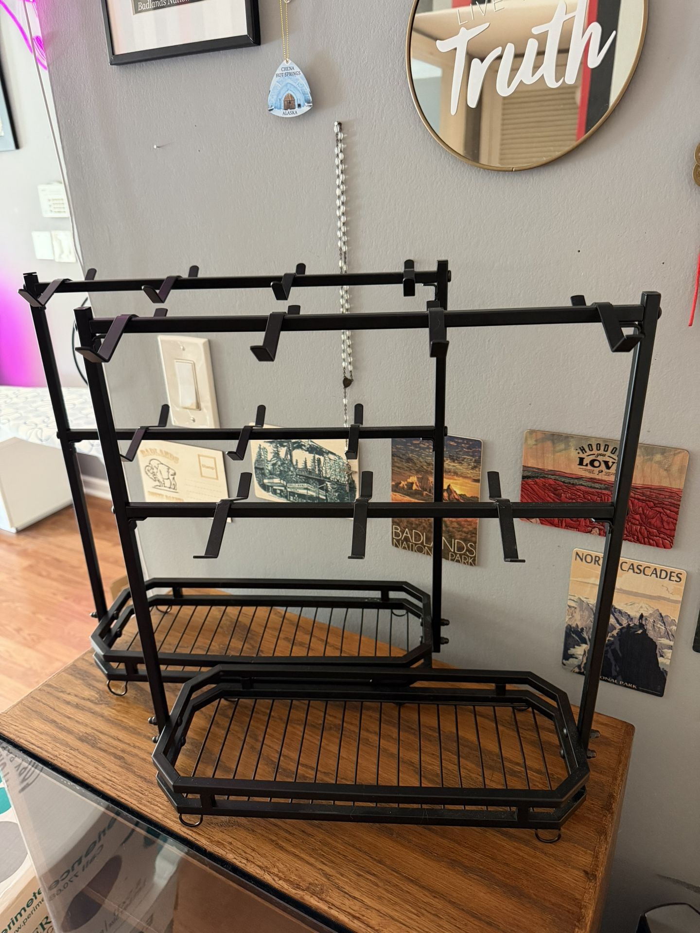 Black metal racks for mugs and glasses, includes hooks and shelf.