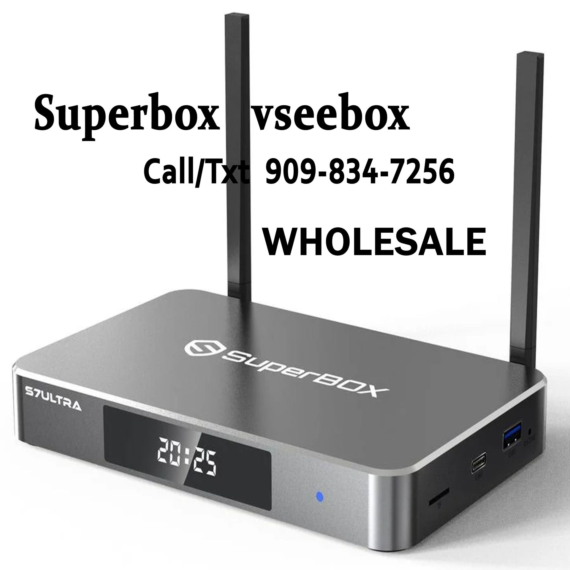 All-New Superbox S7 Max S7 Pro Superbox S6 Pro Max Ultra VSEEBOX ELITE ULTRA VSEEBOX V6 PLUS VSEEBOX V6 Max VSEEBOX V3 PLUS VSEEBOX ELITE MINI Experience next-level entertainment with our most powerful device ever. Featuring 6K resolution and the lightning-fast Cortex-A53 processor. Local pickup in Baldwin Park Ca!! Available with Lowest prices and price match guaranteed. Ask us about WHOLESALE prices. Vseebox v3 plus limited instock $230 each 2-5 box $220 each 5-10 $205 each VSEEBOX V5 PRO 1 BOX $195 2-5 BOXES $190 UNITS 6-9 BOXES $185 UNITS 10+ BOXES $175 UNITS 20 BOXES $170 UNITS More than 20 contact us for wholesale specials New Arrival 2025 Edition 💥VSEEBOX V6 PLUS ( 6 apps multi split screen ) NEW INSTOCK 🔥 1 BOX $240 2-5 contact for pricing 6-9 contact for pricing More than 20 contact us for wholesale specials New Arrival 2025 Edition 💥VSEEBOX V6 MAX NEW INSTOCK 🔥 1 BOX $200 2-4 contact for pricing 5-9 contact for pricing 10+ contact for pricing 20 contact for pricing More than 20 contact us for wholesale specials New Arrival 2025 Edition 💥VSEEBOX ELITE MINI (15 apps) - 1 unit $240 - $225 WHOLESALE PRICES 💥Vsee Elite Ultra. (21 apps) - 1 unit: $310 - Wholesale prices inquired New Arrival 2025 Edition 💥S7 PRO. 32Gb Storage - 1 unit: $170 - 2-4 units: $160 - 5-9 units: $155 - 10+ units: $150 💥S7 Max. 64Gb Storage - 1 unit: $180 - 2-5 units: $175 - 10+ units: $170 - 20+ units: $165 - 40+ units: $160 New Arrival 2025 Edition 💥S7 Ultra. 128Gb Storage - 1 unit: $190 - 2-5 units: $185 - 20 units: $180 - 40+ units: $170 💥S6 PRO. 32Gb Storage - 1 unit: $135 - 2-9 units: $130 - 10+ units: $125 - 20+ units: $120 💥S6 MAX. 64Gb Storage - 1 unit: $165 - 2-3 units: $160 - 4-9 units: $150 - 10+ units: $145 - 20+ units: $140 💥S6 ULTRA. 128Gb Storage - 1 unit: $180 - 2-3 units: $175 - 4-9 units: $170 - 10+ units: $150 - 20+ units: $145 💥SuperBox has 1 year manufacturers warranty 💥Store business hour💥 💥Location: 4219 alderson ave unit C. Baldwin Park 91706, CA 💥 Mon-Sun 10 AM - 5 PM, Call/Text Us Now (909)834-7256 Free Lifetime Updates: Powered by 4GB of RAM and 64GB of storage, this device is a multimedia powerhouse. Enjoy ultra-fast streaming with support for a 1000Mbps Ethernet connection, dual-band WiFi, and the latest WiFi 6 technology. Plus, the upgraded Bluetooth remote with voice command makes navigating your content easier than ever. Content - 6K Media Player - Android TV Box - Free Lifetime Updates - Home Entertainment - Online Content Don't miss out on the chance to transform your living room into an entertainment paradise. Take the plunge into the future of the SuperBox S7 Max Media Player today!