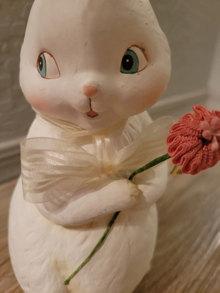 Vintage "Seasons of Cannon Falls" Handpainted White Bunny Figurine with Pink Flower & Tulle Bow (1980's) Add a touch of timeless spring charm to your home with this adorable "Seasons of Cannon Falls" bunny figurine. This sweet, hand-painted white rabbit features delicate blue eyes, soft pink accents on the ears and nose, and holds a beautiful textured pink flower. Finished with its original, dainty tulle bow, this collectible piece captures the whimsical essence of vintage Easter decor. Whether it’s the centerpiece of your spring mantle or a gift for a dedicated bunny collector, this figurine is sure to bring a smile to any space. Brand: Midwest Seasons of Cannon Falls Design: Standing white bunny with hand-painted details and fabric flower Accents: Original sheer tulle neck-bow Condition: Excellent vintage condition (please see photos for details) Style: Perfect for Grandmillennial, Cottagecore, or Shabby Chic decor Bring this "Hoppy" little friend home today! Add to your Easter decor! Dimensions: 10" Tall Cash Only Available for pickup