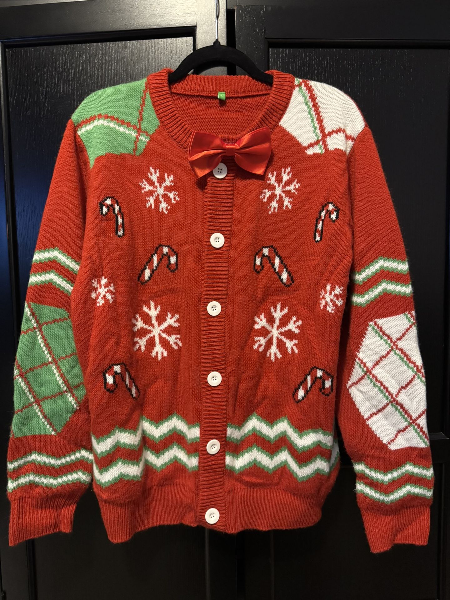 Ugly Christmas sweater. Attached bow tie, buttom up style, very fun and festive for a holiday party.
