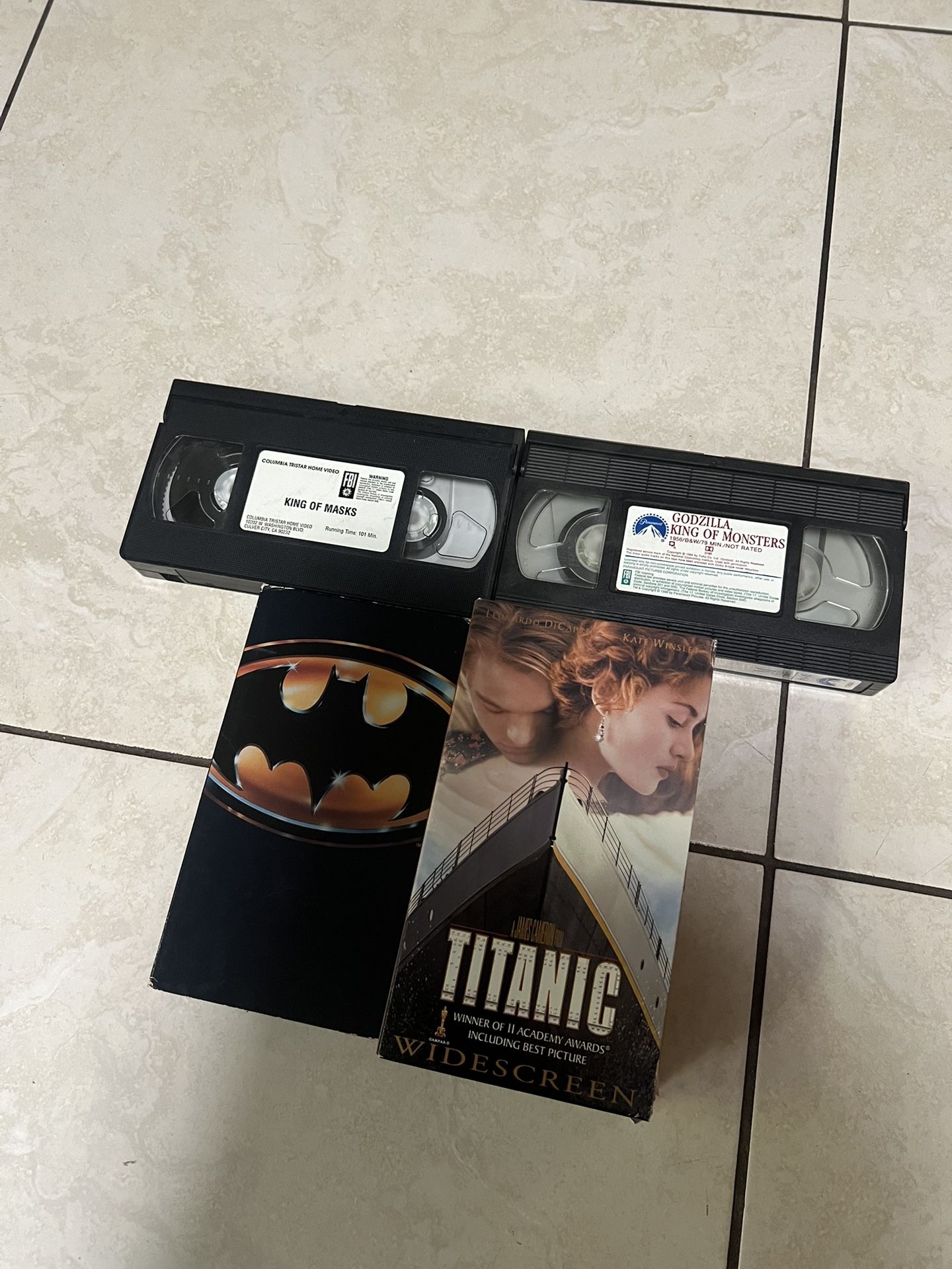 Late 80s and 90s vhs movies 1989 Batman Nicholson Keaton Two cassettes of 1997 titanic 1984 Godzilla, king of monsters 90s king of masks Will not sell vhs separately! Perfect for collection All for 25$!