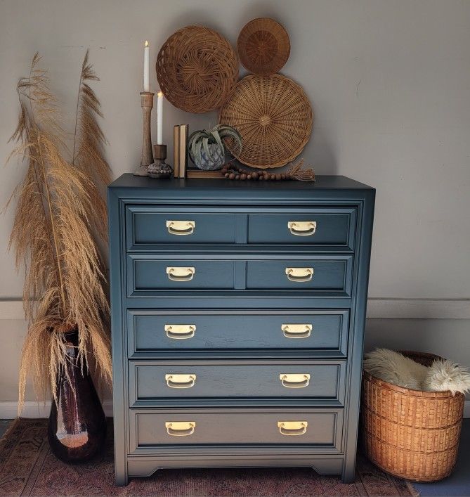 Professionally refinished vintage Thomasville dresser/tallboy in a gorgeous deep blue green. This piece was sprayed in a high quality enamel paint to ensure a lasting finish. All 5 drawers glide smooth and provide ample storage. Dimensions: 38"L x 18"W x 47.5"H π Located in Bethlehem,Ga π² Deposit required to hold item for purchase. Remaining balance is due and cash only upon pickup / delivery. π» Delivery available for additional fee