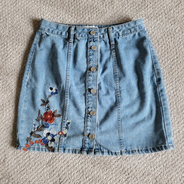 Blue pepper denim skirt with floral embroidery. In great condition, only worn twice. Says medium but I'd say it would fit a 2 or 4 perfect. I'm a 6 and it's too small. Meet at sumner fred meyer. Cash only.