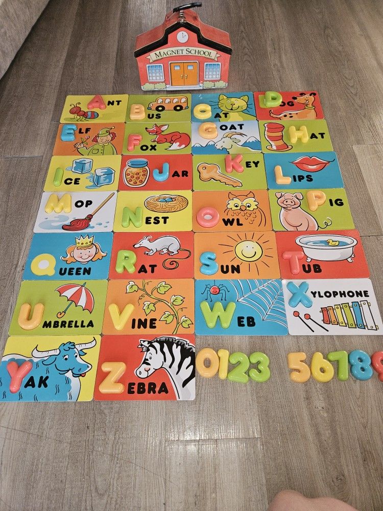 This is a vintage educational toy made by Battat. The tin case is shaped like a schoolhouse and is designed to store magnetic letters, numbers, and picture cards (originally included with the set). It features a take-along handle and a latch closure. The approximate dimensions are 9.5 inches tall, 12 inches wide, and 4 inches deep. Learn your letters and numbers. My kids loved this ❤️ You will get the EXACT items that you see in the pictures Oak lawn pick up or ship