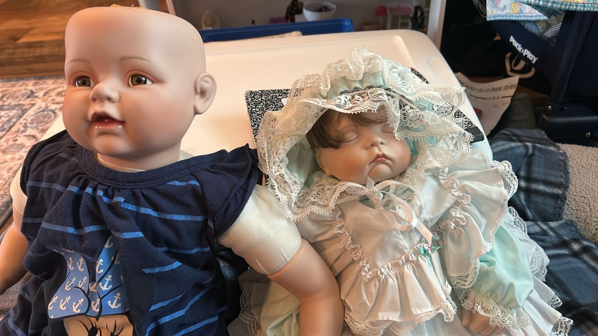 It’s a kit the body is stuffed arms attached all that is left is put the head on and a hand and wig. Comes with a wig, shoes, outfit, headband, and a diaper. For 10$The other doll is 5$ or whatever you see fit as she doesn’t have a wig and is porcelain she comes with a dress and diaper and socks. Together we can negotiate.