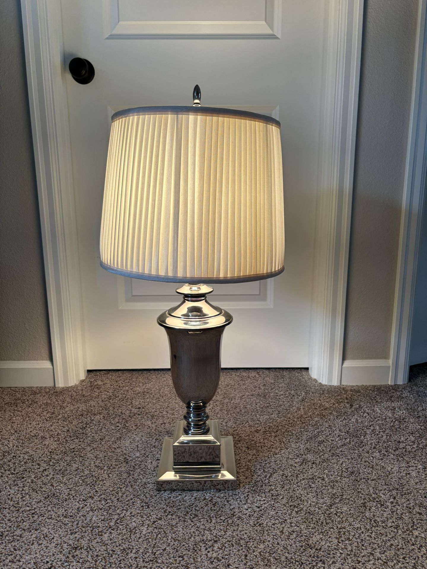 A 31” tall table lamp with an ivory satin pleated shade. Lamp base is 6-1/4” square. Shade is 10-1/2” tall. Like new condition - no scratches and no stains on shade. From a smoke-free home.