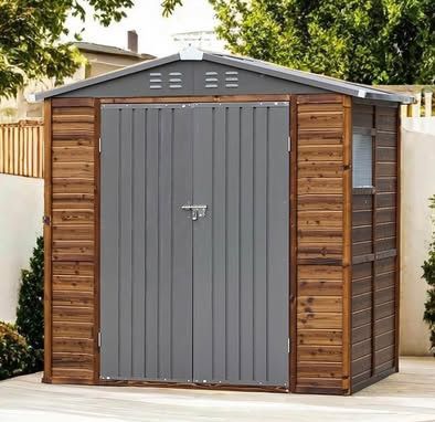 New in Box 6x4 FT Metal & Wood Outdoor Storage Brown Wood Shed w/ Sloping Roof Double Lockable Door