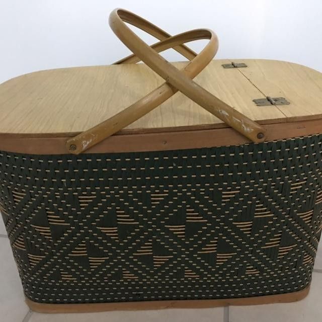 LARGE Hawkeye Picnic Basket with Pie Insert (Burlington, Iowa) - Vintage: Green & Beige Diamond Woven Design ~ Metal Handles Great Hawkeye (Burlington, IA) woven picnic basket - larger size. Neat retro green & beige woven diamond design surrounding basket (faux wicker-type material), Masonite lid with a wood grain design, pie insert, & beige metal handles. No maker label information, stamped on bottom Jan 6, 1979. This "Hawkeye" Basket Hamper was marketed as "America's Finest Hamper". Made by the Burlington Basket Company in Burlington, Iowa. Details: - Extra Large Basket - Measures 20.5”W x 13”D x 12.5”H (without handles). TON of storage space inside! - “Hawkeye” Basket Manufactured by Burlington Basket Company of Burlington, Iowa. Iowa is known as the Hawkeye State. - Hinged Lid, Metal Swing Arms, Attractive Checked & Diamond Design, Wood Bottom & Frame Construction - Late 1970s - Very good vintage condition - some wear from use & chips to Masonite lid - Sturdy Perfect look on a porch or a sunroom. Perfect for extra storage. Or, use for its intended purpose.