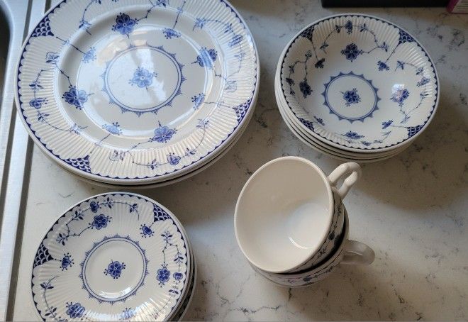 Yes it's available Cash only, pick up in North Hollywood 91601 Set of four (4) "Denmark" design dinner plates, bowls, saucers & three (3) teacup in excellent condition Johnson Bros. England 1883 Dishwasher, freezer & microwave safe