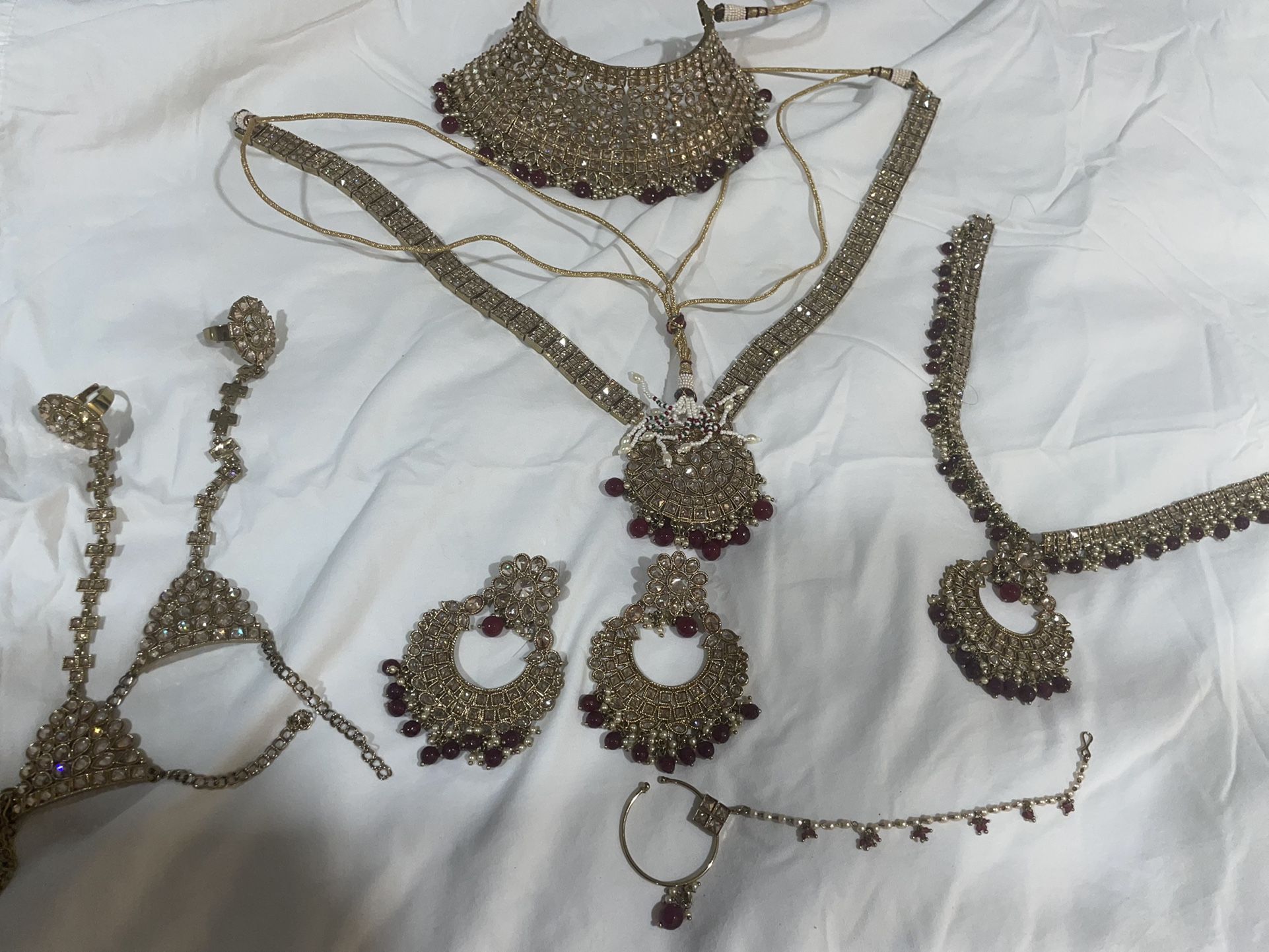 Indian jewelry worn just once in very good condition. Comes with 2 rings attached to bracelets ,a headpiece, a nose piece, earrings and 2 necklaces. Maroon color