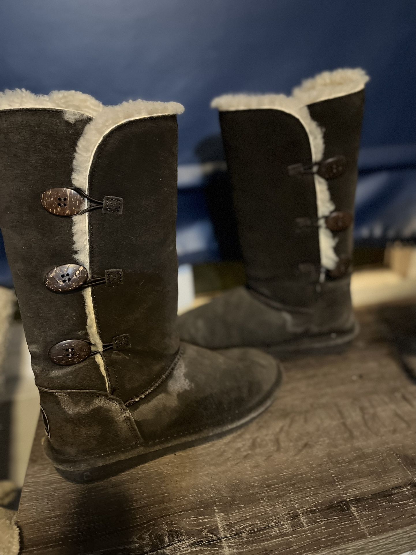BearPaw Lauren suede fuzzy winter Boots Like new, only flaw is a water stain shown in photos. Only wore twice still big and fluffy and comfy on the inside Size 7 True to size