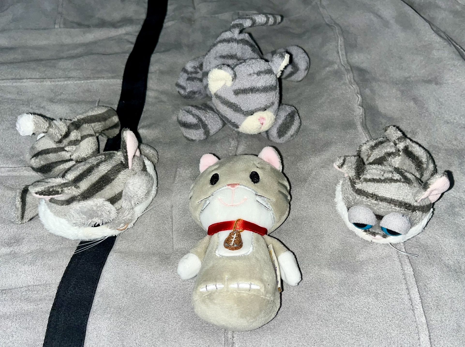 - We have 4 mini gray tabby cat stuffies. - They are from various brands, such as Hallmark Itty Bittys and Ty. - All are in excellent condition. - Ours is a super-clean, non-smoking, pet-free home.
