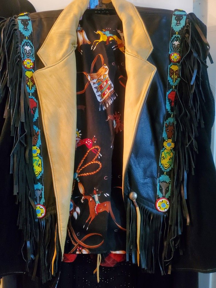 Beautiful heavy leather jacket . Can be worn by man or woman. Size is supposed to be large 21" across in front . 25" top to bottom in back.all size is approx. Has some suede material as well