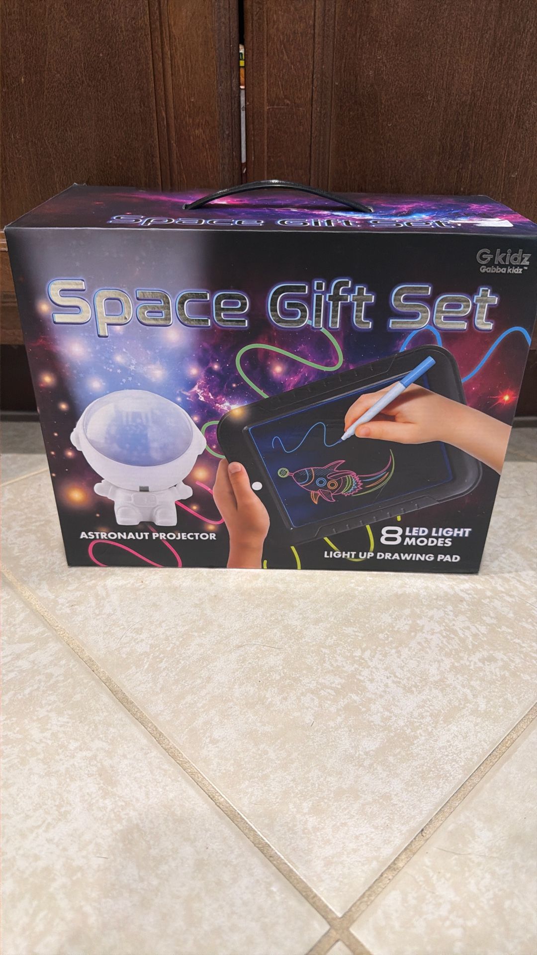 Astronaut projector, light up drawing pad, 30 stencils, six neon pens, reusable wipe cloth
