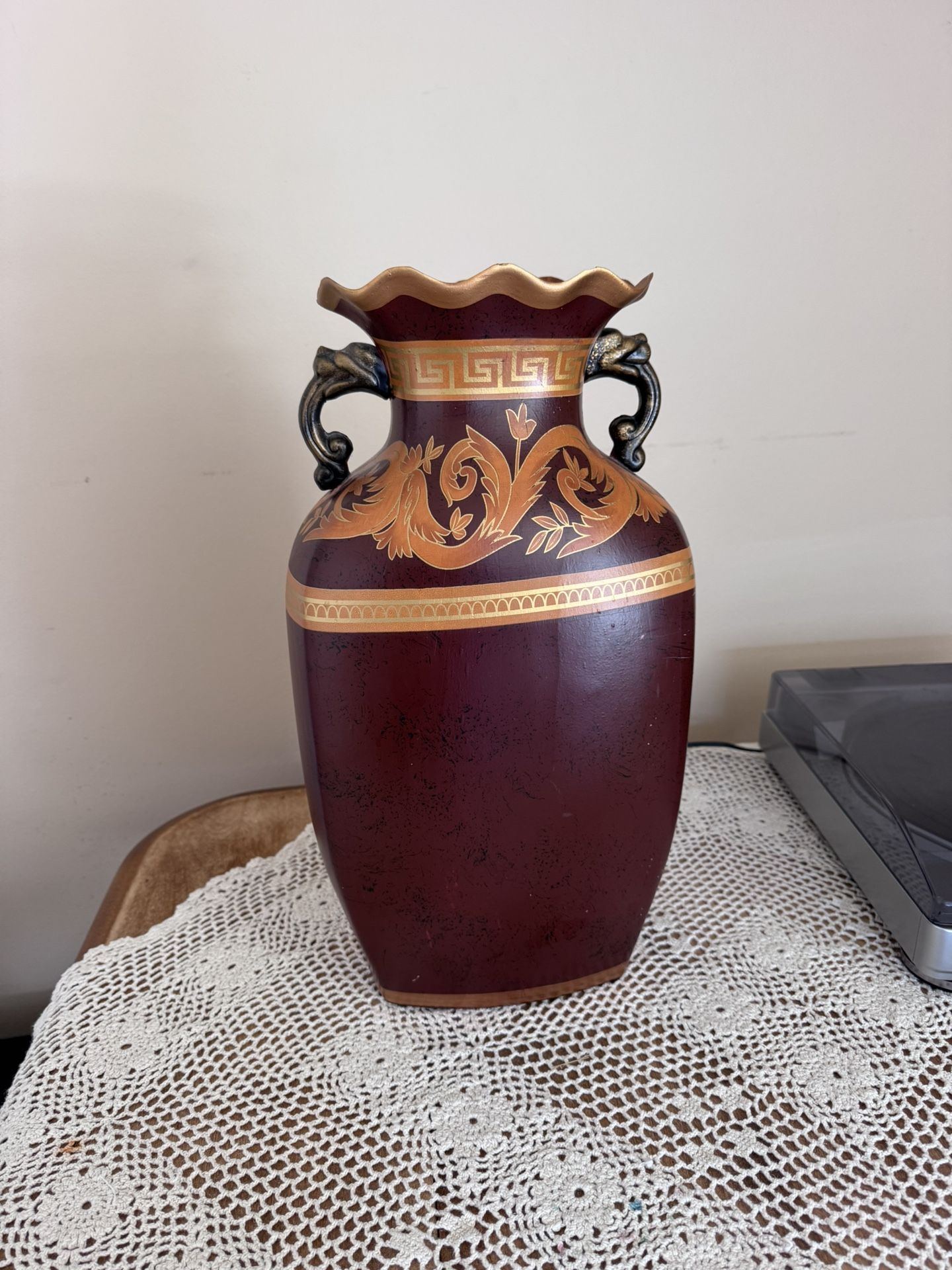 Large decorative vase in deep burgundy color with gold ornamental details and two side handles. Classic vintage-inspired design, great as a statement decor piece for living room, entryway, dining area, or shelf styling. Approximate size: • Height: about 18 inches • Width (at widest point): about 9–10 inches Material appears to be decorative ceramic or composite (not glass). Pre-owned condition: some minor surface wear and small marks consistent with age and use, no visible cracks or chips. Sold as-is, exactly as shown in photos. Beautiful piece for home decor, vintage-style interiors, or decorative staging