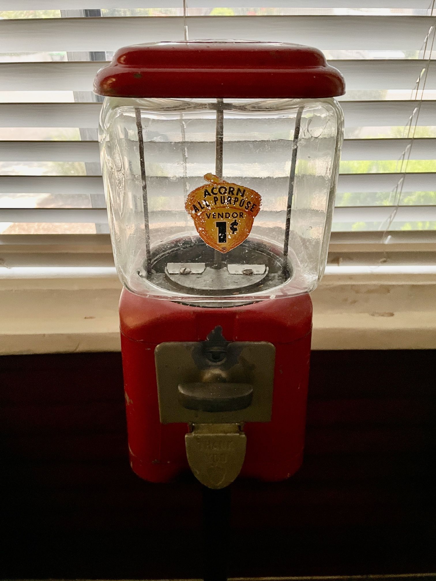 OAK MFG. CO. INC. L. A. CALIF. PAT. Vintage Acorn all purpose vendor 1¢ glass candy, nuts, gumball, red vending, machine on black sturdy stand. Patent# (contact info removed): This specific pattern, filed by Oak manufacture company Inc. on January 9, 1951. There’s a crack in the upper back right hand corner of the glass & not restored, but everything else is in fantastic shape.