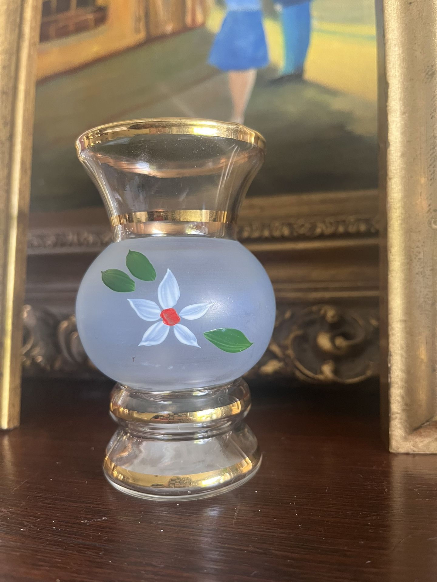 1950s Vintage Hand Painted Frosted Bartlett Collins Gay Fad Vase. Clear & Frosted Glass Vase w Painted Flower and gold trim. Excellent condition. Measurements in photos.