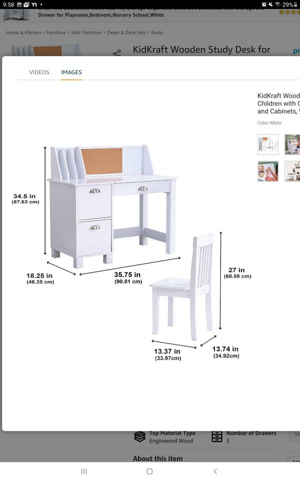 KidKraft Wooden Study Desk for Children with Chair, Bulletin Board and Cabinets, White