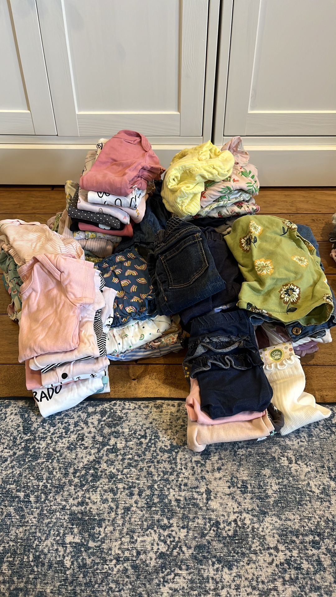 A mix of short and long sleeved onesies, pants, bubble shorts and rompers. 3 zipper PJs and a pair of socks. 4 unused long sleeve fleece sleep sacks. Approximately 75 items.