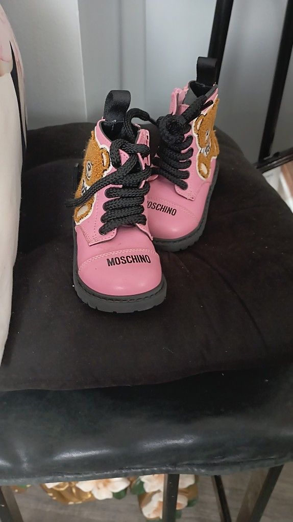 MOSCHINO Sz. 3.5T Pink with Toy Bear embroidery lace up front and inner zipper ankle boots.