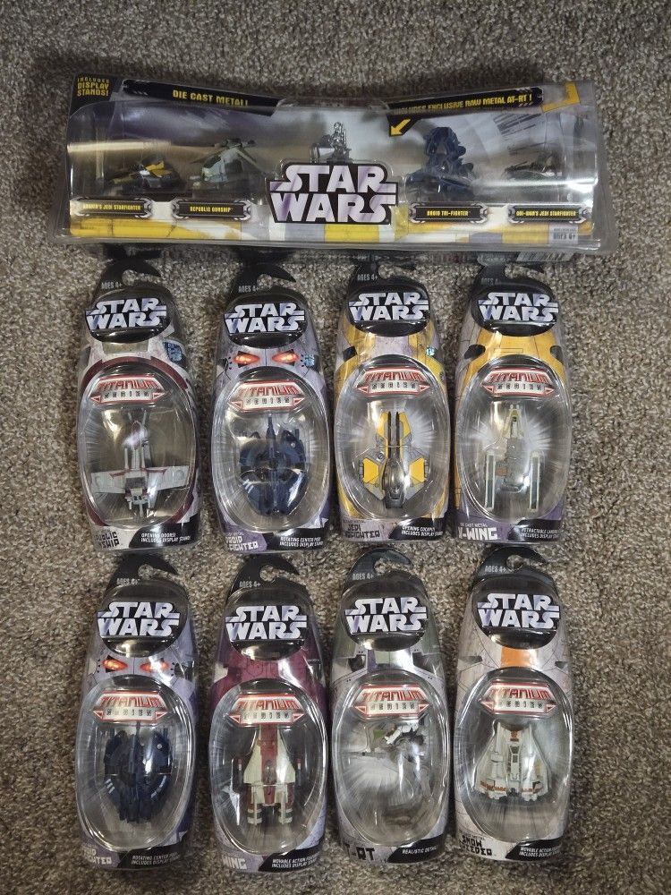 Selling a lot of 15 Hasbro Galoob Titanium Series Die-cast metal Micro Machines and Micro Vehicles from 2005. All are new mint on card and sealed in excellent condition with very minor shelf wear and bright colors with clear bubbles. Included in this lot is; Jedi Starfighter A-Wing Droid Tri-Fighter X2 Y-Wing Snow Speeder Republic Gunship AT-RT 5 vehicle set with exclusive raw metal AT-RT A New Hope - Tatooine Desert Set Return Of The Jedi - Death Star Attack Set Revenge Of The Sith - Set III Revenge Of The Sith - Set II Return Of The Jedi - Space Assault Set Revenge Of The Sith - Set I These would make great display pieces.