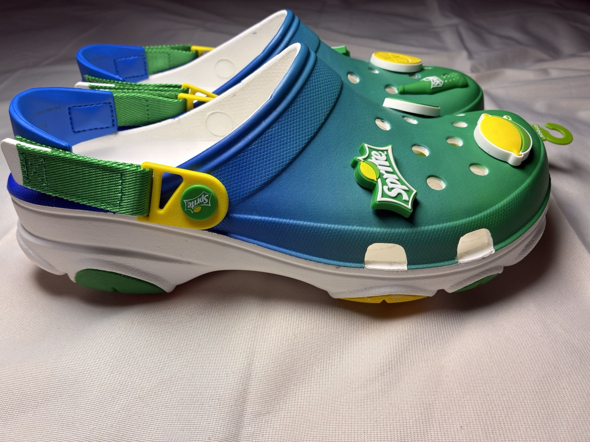 Brand new Crocs Classic clogs in a fun Sprite lemon-lime themed design. Features gradient green/blue colorway with Sprite-inspired Jibbitz charms including lemon, lime, and bottle graphics. Size: Men’s 10 / Women’s 12 Brand new with tag Lightweight and comfortable Croslite™ foam • Unique Sprite collaboration design