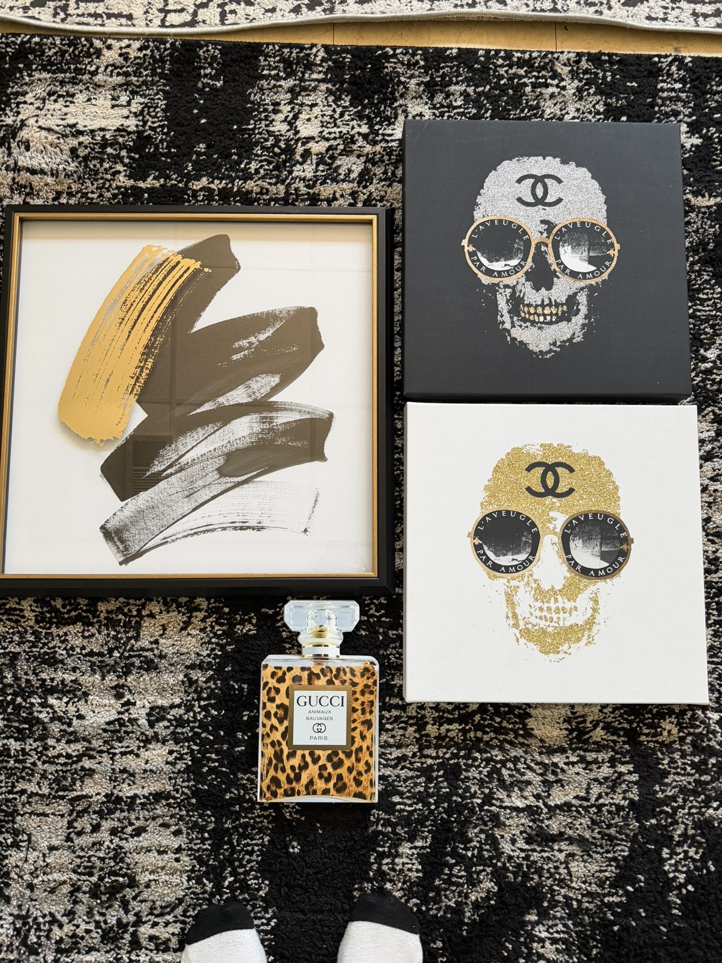 Four Piece Wall, Art Canvas, Framed Glass, Picture And Wood, Tabletop Decor, Skull Cheetah Gold, Black, White Silver