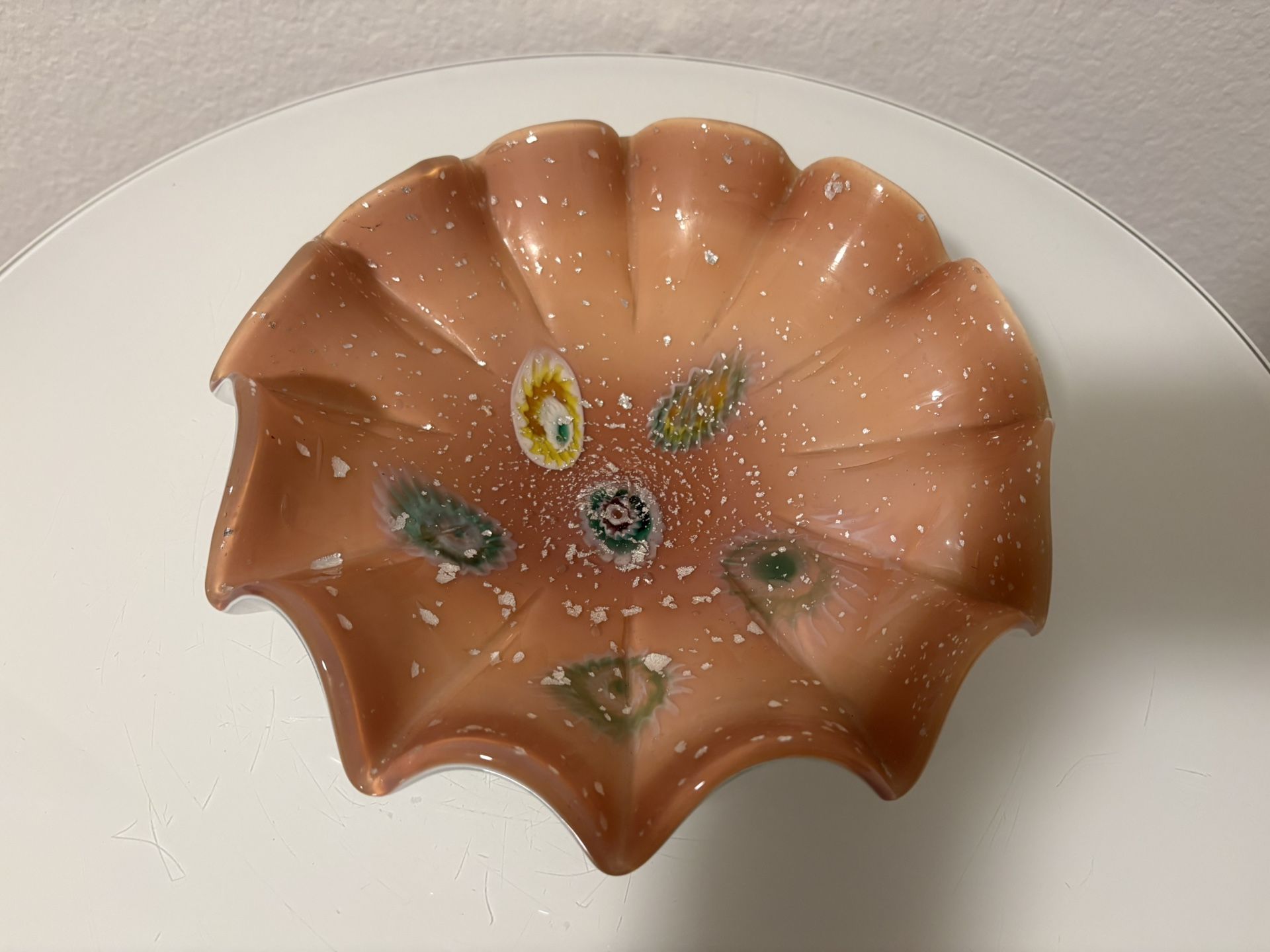 Dimensions: 9 1/2” Across x 3” Tall This is likely Murano but there is no sticker. Unusual and beautiful soft pink peach tone with a kaleidoscope of colorful accents and silver specs. Ruffle rim. White underneath. Handblown art glass. In excellent condition. Pickup location is near N. 60th Street and Greenway, Scottsdale.