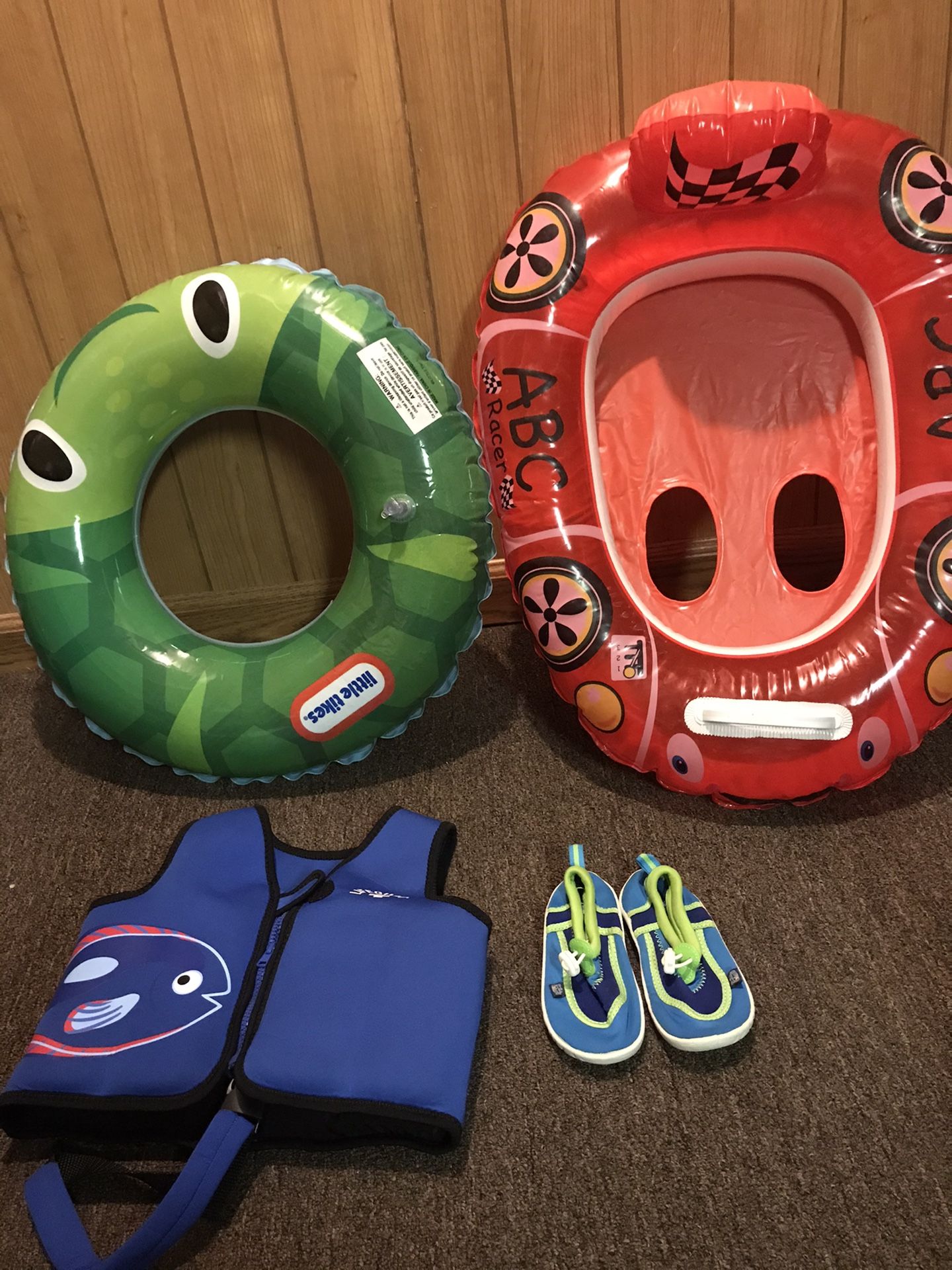 2 little kids floats swimming shoes size L(9,10) and life jackets 33-55 Lbs & 22 chest