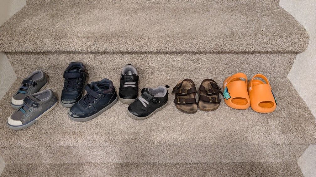 From left to right Gray See Kai Run size 7 $10 Blue Stride Rite High Tops size 8 $15 Black Stride Rite size 6 $10 Old Navy Sandals size 7 $5 Koala Baby Orange Sandals size 5 $5 Prices are listed individually or make an offer for multiple pairs