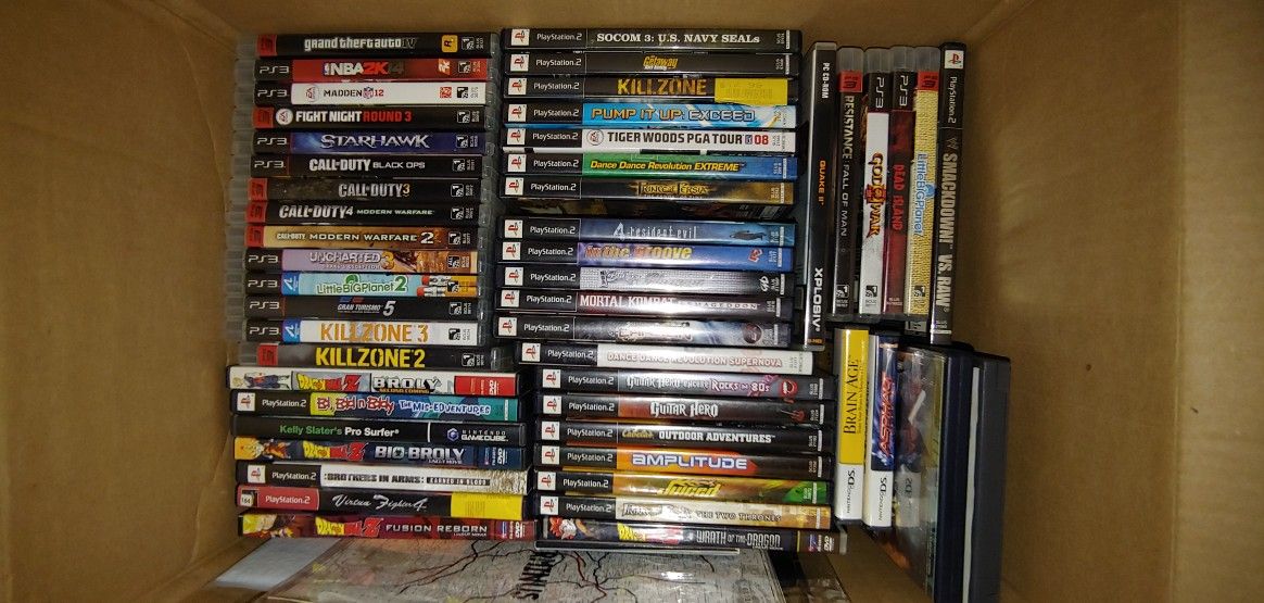 List: Ps2: Beatmania Prince of persia two thrones Prince of persia Socom 3 The getaway Wwe smack down vs raw Virtual fighter 4 Peter jackson king kong Ed edd eddy misadventures Hulk ultimate destruction Juiced Resident evil 4! PS3: Grand theft auto 4 “want to go bowling?” Resistance fall of man GOW3 Dead island Little big planet Gamecube: True crime streets of LA Kelly slaters pro surfer DS: Brain age training Asphalt urban gt