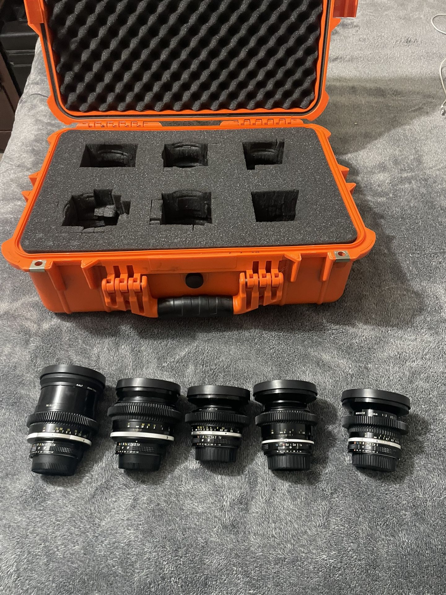 Vintage Nikon AIS lens set. Fully cinemodded ready to shoot. Equipped with metal focus gears and declicked apertures. Includes step up rings and arri lens caps. All in excellent condition. Message me for more photos. Lens Set: 24mm F2 35mm f1.4 50mm f1.2 85mm f1.4 105mm f1.8 All version of the lenses have the widest apertures. Comes with the case. Make an offer.