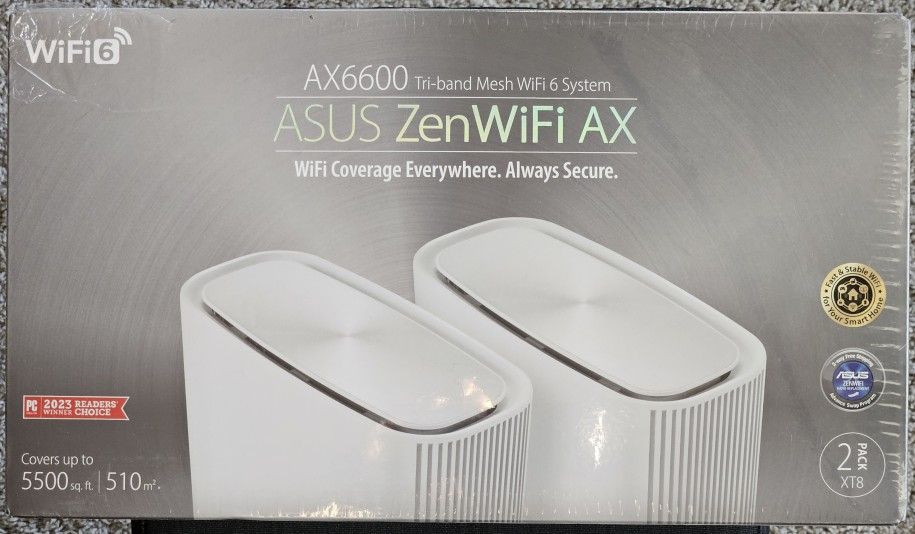 ASUS ZenWiFi AX6600 (XT8 2-pack) Tri-Band Mesh WiFi 6 System ***BRAND NEW, NEVER OPENED Maximum Range: 5500 Sq Ft. Wireless Speed: 6600 Mbps Power Supply: • AC Input: 110V~240V(50~60Hz) • DC Output: 19 V with max. 1.75 A current • DC Output: 12 V with max. 3 A current